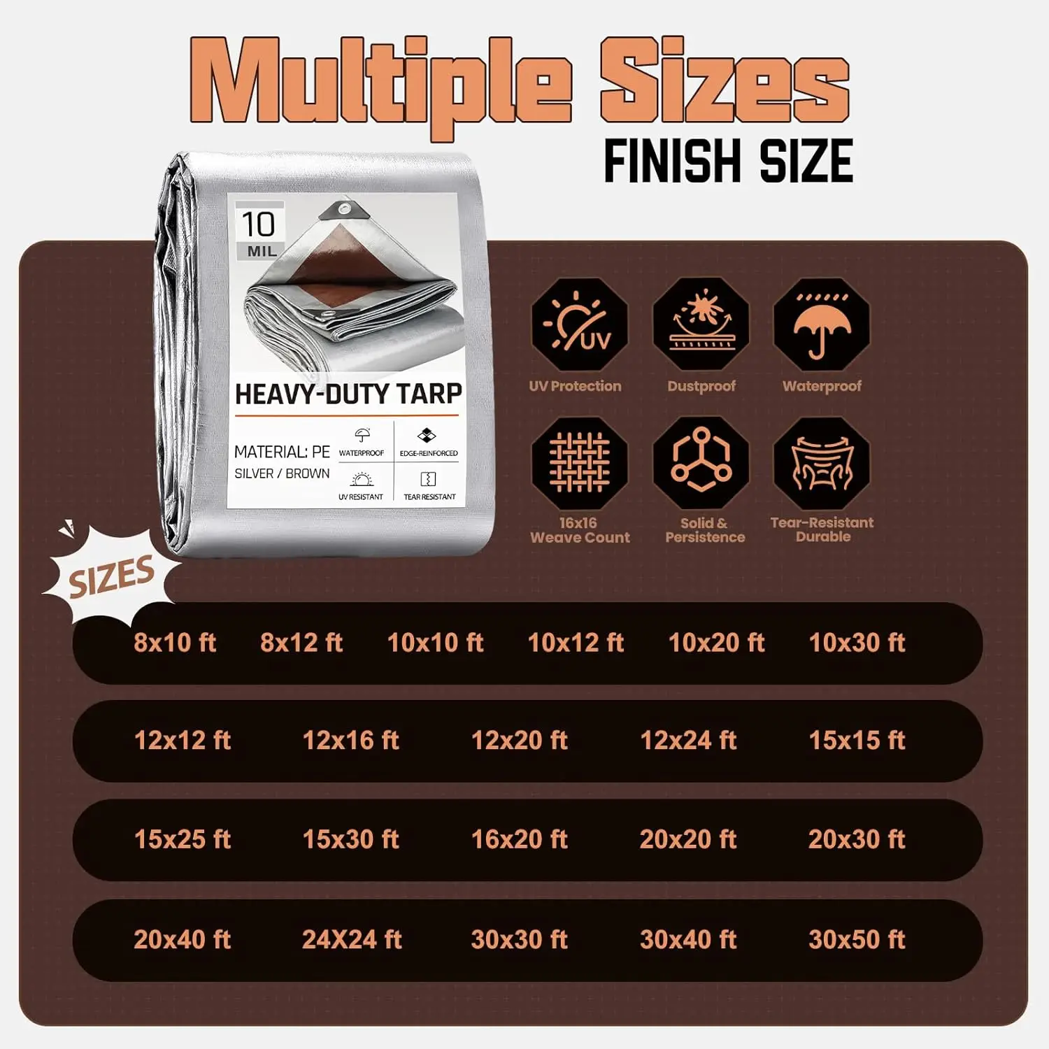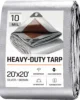 This heavy-duty tarp is designed to provide reliable protection for various outdoor applications. Key features include: 1. Durable Construction: Made from high-quality materials with a 10 mil thickness, ensuring long-lasting use and resistance to wear and tear. It is waterproof and weather-resistant, ideal for shielding against rain, sun, and other elements. 2. Versatile Applications: Perfect for covering outdoor furniture such as patio sets and pool equipment, as well as camping tents, boat covers, roof protection during construction or storage, and general-purpose use in gardens or workshops. The tarp can be used in multiple settings to safeguard your belongings from damage. 3. Multi-Size Options: Available in large sizes like 20×20 feet and smaller variants to suit different needs, allowing you to choose the right fit for specific projects or items without excess material waste. This flexibility makes it a practical choice for both residential and commercial users. 4. Color Variations: Offered in silver or brown colors to blend with various environments or personal preferences; silver reflects sunlight to reduce heat absorption while brown provides a natural look that complements outdoor spaces discreetly without drawing attention unnecessarily when not in use actively protecting something valuable underneath its surface area coverage capabilities extend beyond typical tarps due enhanced durability features mentioned earlier ensuring value over time through repeated usage cycles under harsh conditions where lesser products might fail prematurely thus saving money on replacements frequently needed otherwise if using inferior alternatives lacking these robust attributes designed specifically withstand demanding tasks encountered regularly by consumers seeking reliable solutions their protective needs across diverse scenarios involving exposure elements year-round regardless season changes impacting performance consistency maintained throughout product lifespan thanks careful manufacturing processes prioritize quality control standards exceed industry norms commonly found similar items market today offering peace mind knowing investment made will deliver expected results consistently without unexpected failures disrupting planned activities reliant upon effective coverage provided by this tarp model tailored meet high expectations discerning buyers who prioritize functionality aesthetics combined seamlessly into one product package delivering superior protection compared competitors while remaining affordable price point accessible wide range customers looking enhance their outdoor living experiences safely securely.