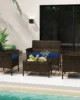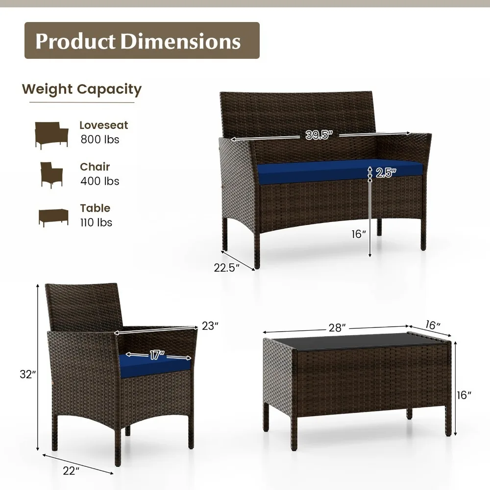 Elevate your outdoor relaxation with this elegant 4-piece patio rattan conversation set, designed for both style and durability. Crafted with exquisite and long-lasting woven rattan and supported by robust metal frame, this set features both stability and longevity. The set includes a loveseat and 2 sofas with ergonomically curved armrests and high backrests, ensuring maximum comfort. Accompanied by a coffee table featuring a spacious glass top, your essentials are always within reach. Perfect for any outdoor setting like backyards or poolside retreats, this beautiful rattan ensemble is a prime choice for those seeking a tranquil oasis.