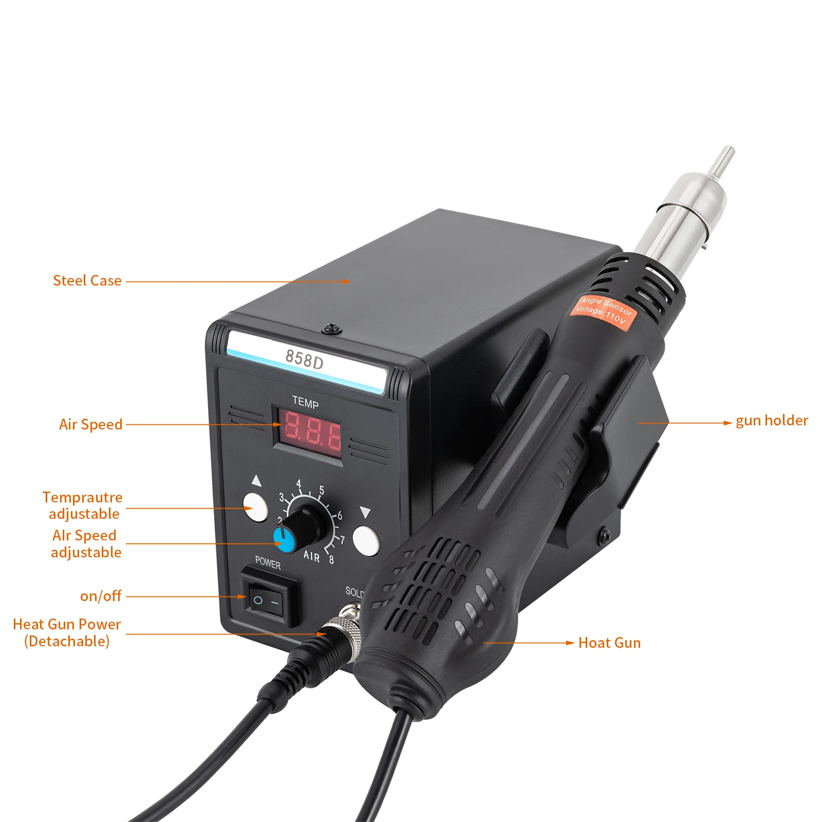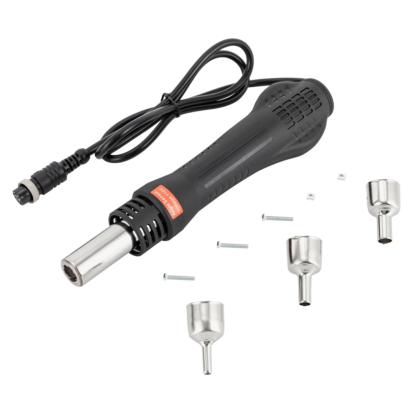 Built-in Angle Sensor: The built-in induction switch of the hot air gun allows for automatically entering a standby mode when the air outlet is facing up and rapid reheating when it is facing down.