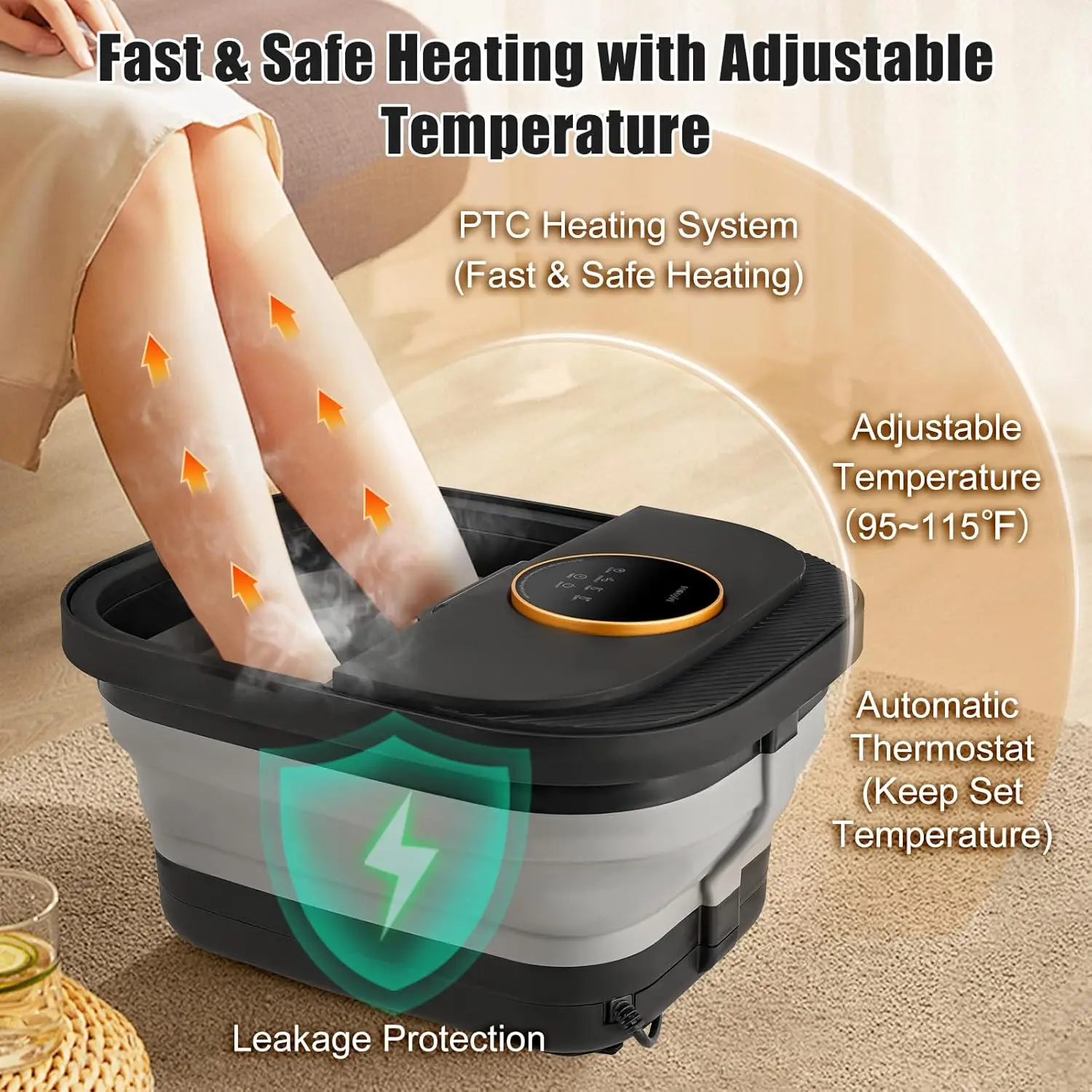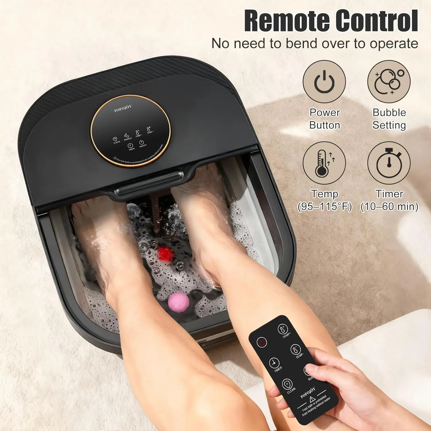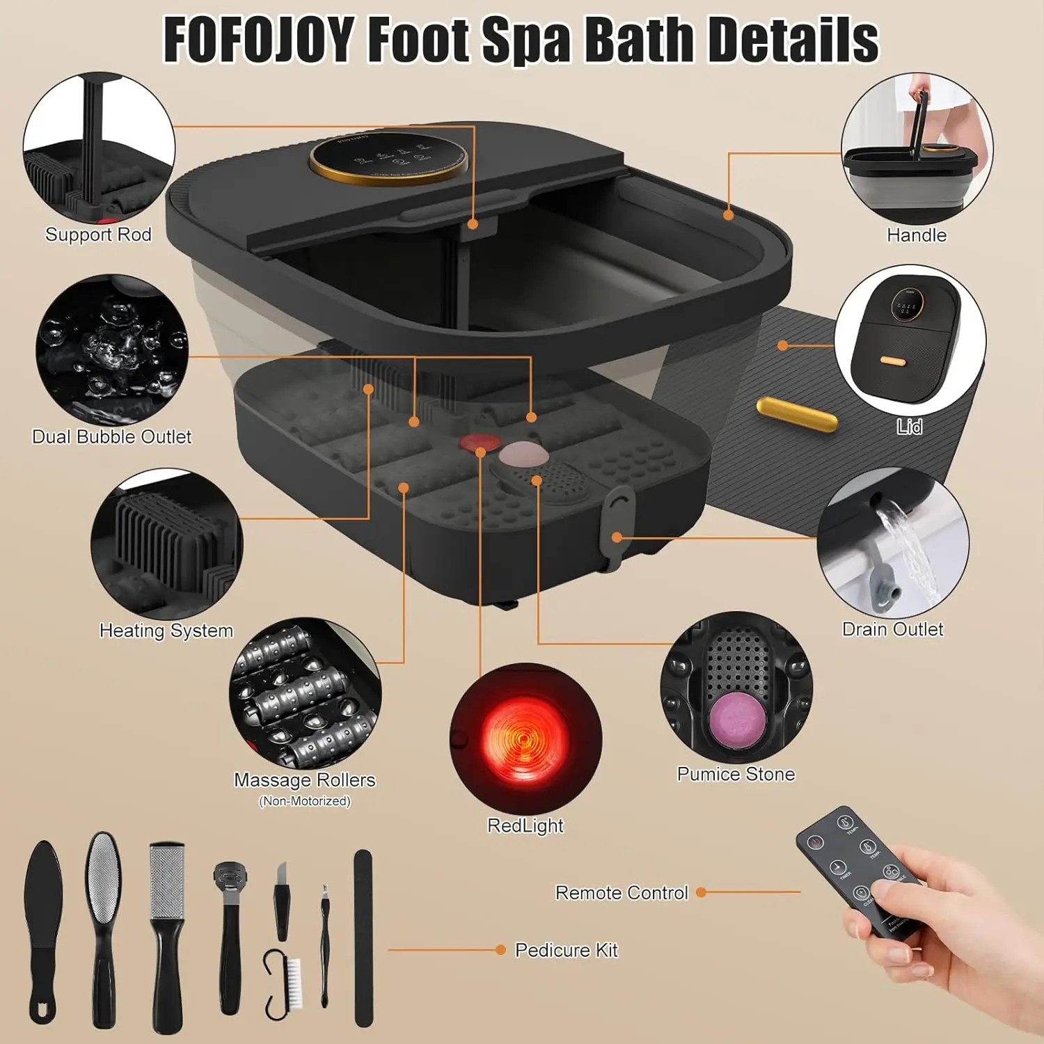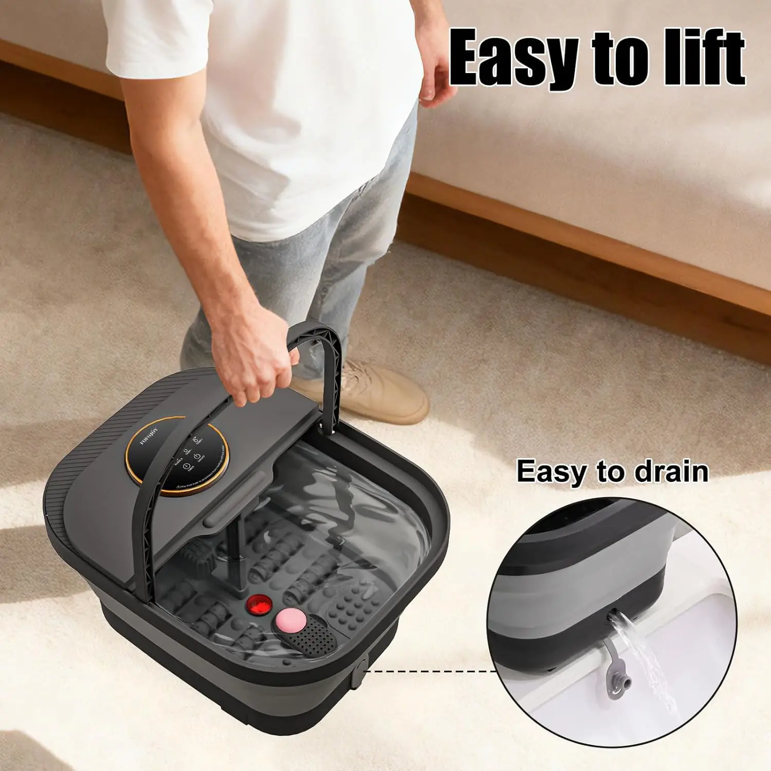 Experience ultimate relaxation and foot care with our advanced heated foot spa massager. Designed for both men and women, this versatile device offers a range of features to soothe tired feet and enhance your pedicure routine. Key Features: – Heat Function: Enjoy adjustable temperature control to warm water for a comforting soak that helps relieve stress and improve circulation. – Bubble Massage: Gentle bubbles provide a soothing massage effect, promoting relaxation and easing muscle tension in your feet. – Remote Control & Touchscreen: Easily operate the spa from a distance with the included remote or use the intuitive touchscreen for convenient adjustments without bending down. – Pumice Stone Included: Comes with a built-in pumice stone attachment to help remove dead skin and smooth rough areas during your foot bath, making it ideal for at-home pedicures. – Plus Size Design: Accommodates larger feet comfortably, ensuring a perfect fit for all users, including men and women seeking extra space. Benefits: This foot spa is perfect as a thoughtful gift for mothers, fathers, or anyone who enjoys self-care. It combines heat therapy with bubble massage to create a spa-like experience at home. The temperature control allows you to customize your soak to your preference, while the remote and touchscreen add ease of use. Use it regularly to pamper yourself after a long day or as part of your grooming routine. Made from durable materials, it’s built to last and easy to clean after each use. Why Choose This Product: Our foot spa stands out by offering multiple functions in one compact unit—no need for separate devices. It’s designed with user comfort in mind, featuring ergonomic controls and safe operation. Whether you’re looking to relax sore muscles or maintain healthy feet, this massager delivers effective results. Order now to transform your daily foot care into a luxurious treat!
