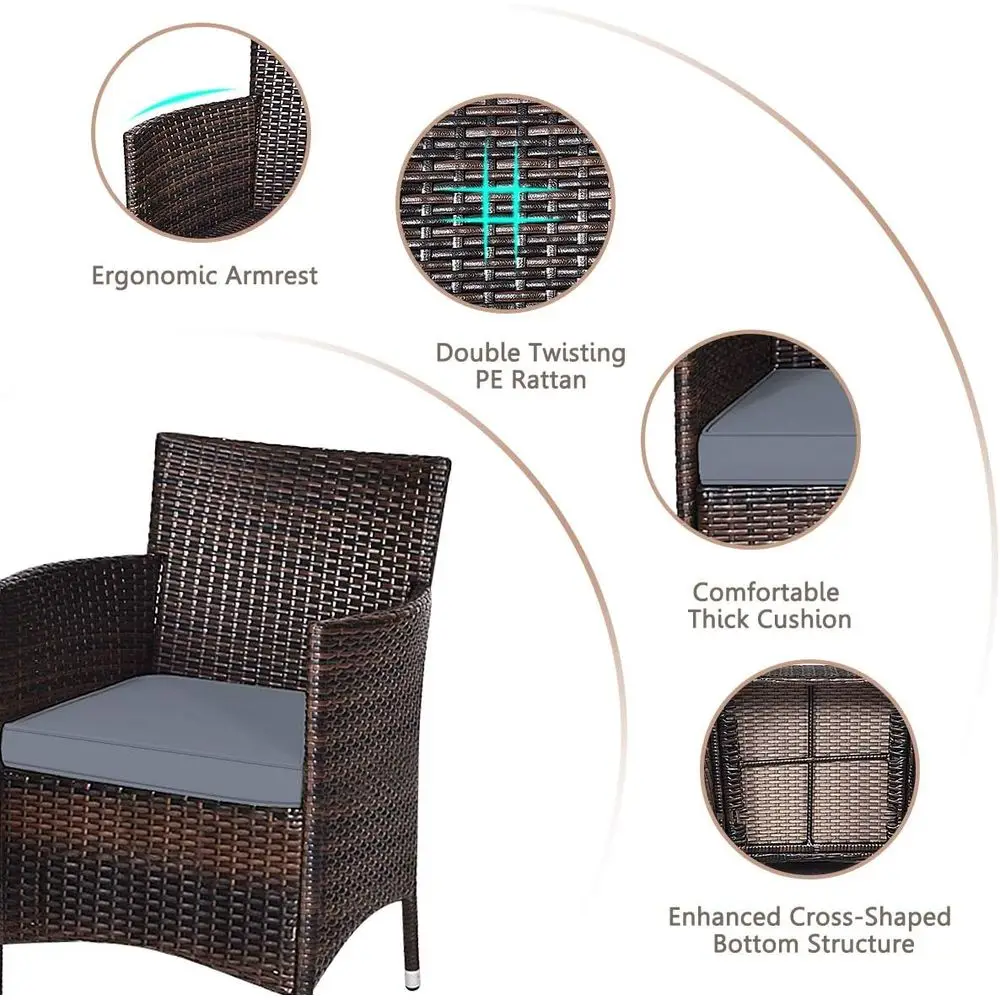 This 3-piece rattan conversation furniture set, consisting of two wicker chairs and a coffee table with a tempered glass top, is perfect for enjoying leisure time in your backyard, porch, garden, poolside, or balcony. It combines elegance with simplicity, creating a relaxing space.