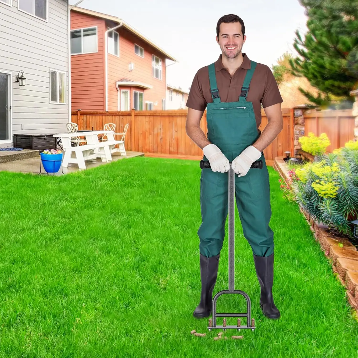 Enhance your lawn’s vitality with our premium manual aerator. This tool is designed to improve soil health and promote lush grass growth through efficient aeration. Key Features: – Constructed from durable stainless steel for long-lasting performance and resistance to rust. – Equipped with a soft rubber grip that ensures comfortable handling during extended use, reducing hand fatigue. – Features four coring plugs that effectively remove soil plugs, allowing better air, water, and nutrient penetration into the lawn roots. – Ideal for loosening compacted soil in gardens, yards, or small lawns to enhance drainage and root development. – Lightweight and easy-to-use design makes it suitable for homeowners and gardening enthusiasts without requiring power tools. Benefits: – Improves lawn health by reducing soil compaction, which can lead to stronger grass and fewer weeds. – Helps in water conservation by enabling better absorption and reducing runoff. – Promotes a greener environment by supporting natural soil aeration processes without chemicals. Usage Tips: 1. Use on moist soil for easier plug removal; avoid overly dry or wet conditions. 2. Push the tool into the ground at regular intervals across the lawn area for uniform aeration. 3. Clean after use to maintain tool longevity and prevent dirt buildup on the stainless steel surface. This garden tool is perfect for maintaining a healthy lawn throughout the seasons. It’s an essential addition to any gardening toolkit, offering practical benefits for both novice and experienced users. Invest in this reliable aerator to see visible improvements in your outdoor space over time.